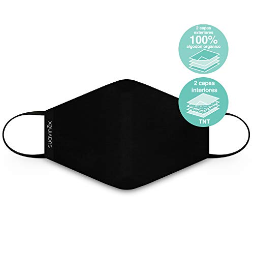 Suavinex 401323 mascherine igieniche per bambini riutilizzabili certificate e approvate 6-10 anni. 3 strati. 25 cicli di lavaggio. Prodotto in Spagna, 2 unità, Denim e Nera - 29 g