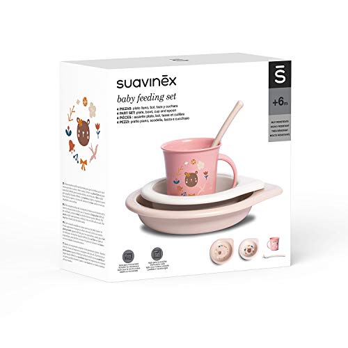 Suavinex, Set di stoviglie per bambini composto da piatto piatto + ciotola + tazza + cucchiaio, 4 pezzi, a partire da 6 mesi, lavabile in lavastoviglie