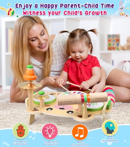 Subtail Tamburo Bambino - Strumenti Musicali Bambini - Giochi Batteria Bambini 1 Anno - Giochi Montessori 1 2 3 Anni -Giocattoli In Legno Bambini 1 Anno - Musica Regalo Bambino 1 Anno