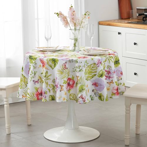 SUCHDECO Tovaglia Antimacchia Rotonda 150 cm Impermeabile con Fiori Rossi e Piante Tropicali, per Tavolo da Cucina, Pranzo, Giardino, Picnic, Esterno, Feste, Compleanno