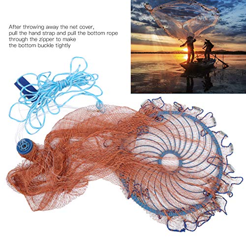 【Facile da usare】Rete da lancio facile, facile da lanciare, resistente, forte forza di trazione, non facile da strappare, può aiutarti a riempire il pesce ogni volta. Dopo aver gettato via il coperchio della rete, tirare la cinghia a mano e tirare la corda di fondo attraverso la cerniera per rendere la fibbia di fondo strettamente. L'intera rete forma un grande sacchetto di rete per pesci.