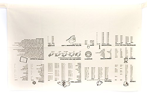 Le istruzioni comprendono: conversioni numeriche, tempi di cottura, tempi di arrosto, tempi di congelamento, istruzioni di scongelamento, un glossario di cucina ed altroProdotto in 100% cotone grezzo