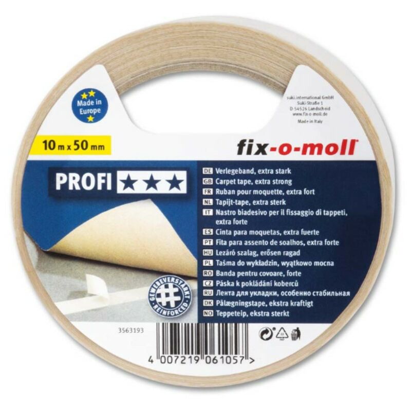 FIX-0-MOLL - 10mt x 50mm - NASTRO BIADESIVO PROFESSIONALE PER MOQUETTE - CON FIBRE RINFORZATE Caratteristiche: Sei sulla strada giusta con il nastro per moquette PROFI di fix-o-moll. Con fibre rinforzate e un adesivo molto forte, la sua tenuta è particolarmente sicura. Questo prodotto resiste senza problemi anche a carichi pesanti, ad esempio la pressione sulla moquette incollata sulle scale. Il nastro per moquette PROFI è permanentemente adesivo su entrambi i lati, quindi è un aiuto perfetto.