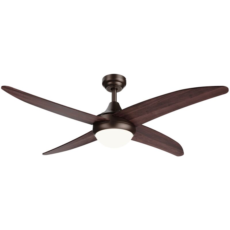 Ventilatore da soffitto DC da 122 cm di diametro, ideale per ambienti da 14 a 20M2. Con corpo in metallo marrone e quattro lame in compensato dello stesso colore. Motore DC di alta qualità che consente prestazioni elevate con consumi e rumorosità minimi. Funzione estate/inverno inclusa. Per due lampadine E27, non incluse, che si comandano tramite telecomando con timer. Dimensioni (cm): 122x40-52,5cm;