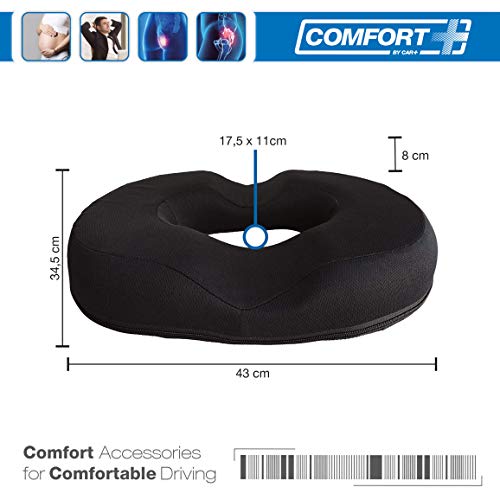 Il cuscino Car+ con le sue dimensioni di 43 cm x 34,5 cm ad anello è adatto per tutti i tipi di sedili in ufficio, auto, a casa e in viaggio. Il fondo antiscivolo lo rende la scelta migliore per aumentare il comfort su qualsiasi superficie.