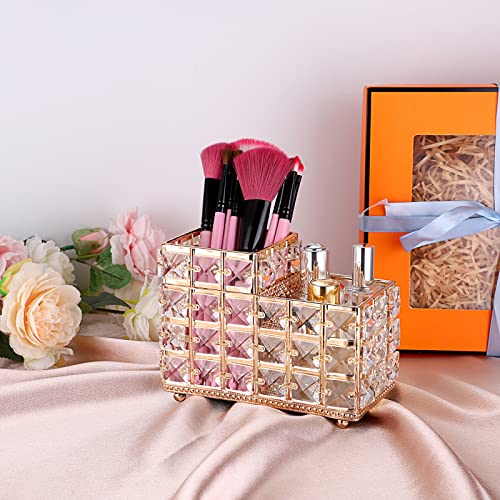 SUMNACON Contenitore rettangolare con 2 scomparti per pennelli da trucco, eyeliner, matite per sopracciglia, matite, matite, cosmetici, pennelli da trucco, con perline di cristallo quadrate (oro)