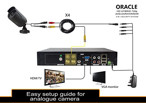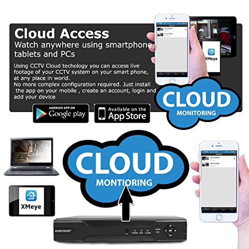 Sumvision - Sistema di telecamere di sicurezza CCTV AHD DVR NVR registratore Oracle Hybrid 720p CCTV Sistema di sicurezza con telecamere di visione notturna a prova di intemperie 960H/D1, uscita HDMI/VGA/BNC, 1000TVL ad alta risoluzione, alloggiamento in metallo resistente agli agenti atmosferici, tecnologia P2P, servizio e-cloud, accesso rapido al codice QR per smartphone, accesso remoto 4 Channel DVR/NVR 4 Camera with 1TB HDD