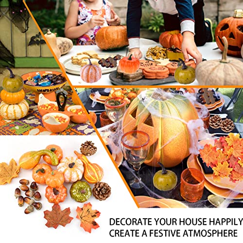 PACCHETTO - Ottieni 30 pezzi di foglie d'acero artificiali, 10 pezzi di ghiande, 8 pezzi di zucche di diverse forme, 2 pezzi di pigne. Il totale è di 50 pezzi. Con queste zucche decorative puoi trasformare la tua casa in una bellissima casa delle fiabe il giorno del Ringraziamento o Halloween.