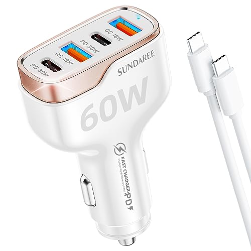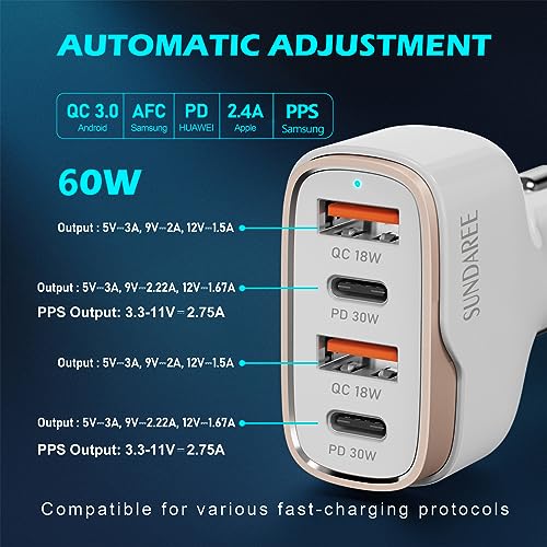 SUNDAREE Accendisigari USB C Cavo,60W Multi 4 Porte 12V 24V PD QC Fast Charge Carica Rapida Tipo C Caricabatterie Auto Cellulare Adattatore for Samsung A14 A34/Redmi Note 12/OPPO/iPhone/Galaxy Tab