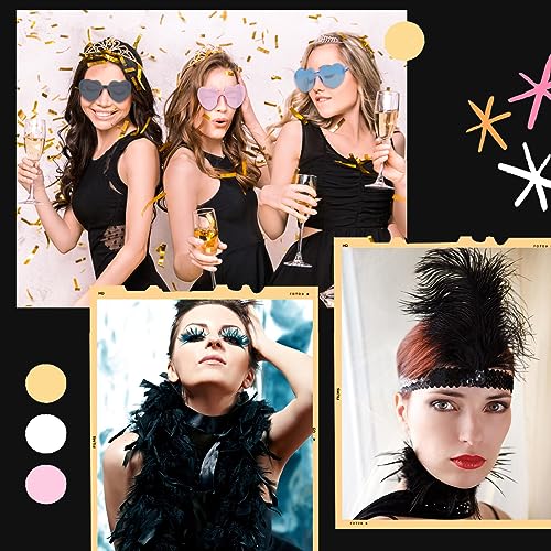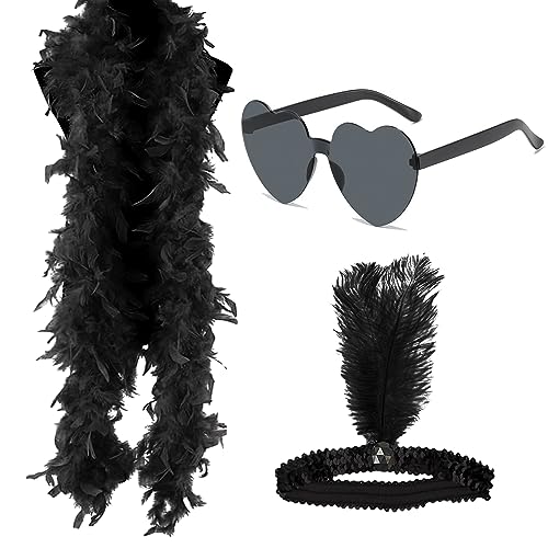 SunnyLisa Boa Piume Nero, Boa di Piume Nero + Occhiali a Forma Cuore + Fascia per Capelli con Piume, Scialle di Piume per Feste, Carnevale, Halloween, Natale, Accessorio per Costumi Degli Anni '20