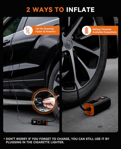 [Alimentazione doppia a batteria e 12v DC] Godetevi la libertà di scegliere tra la comodità del cordless e l'affidabilità dell'alimentazione. Il gonfiatore di pneumatici a batteria è dotato di una batteria ricaricabile integrata da 2500*3mAh per 40 minuti di gonfiaggio senza fili. Il cavo di alimentazione CC da 9,8 piedi incluso si collega all'accendisigari dell'auto, garantendo il gonfiaggio anche se la batteria si esaurisce.