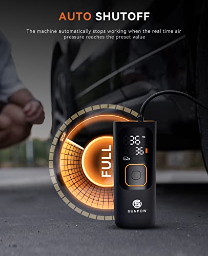 SUNPOW Compressore Aria Portatile Auto, Pompa Aria Cordless 160PSI, Automatico Spegnimento a Doppia Alimentazione da 12V DC con Doppio Schermo LCD, per Auto, Palloni, Biciclette