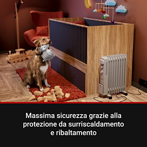 LUNGA DURATA DEL CALORE: le 9 alette riscaldanti non solo diffondono rapidamente il calore grazie alla loro ampia superficie, ma sono anche in grado di conservarlo per un tempo lungo. Anche quando il radiatore a olio è spento da tempo, l'olio e la robusta struttura metallica collaborano perfettamente per conservare il calore a lungo. Questo rende il radiatore elettrico particolarmente efficiente e a risparmio energetico.