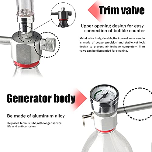 Essere realizzato in lega di alluminio. È forte, durevole ed efficiente. Tappi e tubi ben sigillati, a tenuta stagna, non deformati, mai allentati. Manometro professionale per l'osservazione della pressione. Economico, semplice da creare costantemente CO2 pura mediante reazioni chimiche.