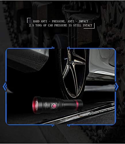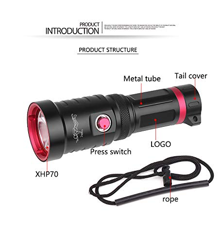 BATTERIA A LUNGA Alimentata dalla nostra batteria ricaricabile da 5000 mAh, 3,7 V 26650, questa torcia subacquea dura 2 volte più a lungo delle torce con batterie 18650. Il tempo di funzionamento continuo si estende per 15 ore in modalità bassa, 2 ore in modalità alta. tempo di lavoro continuo più lungo della torcia, molto conveniente per la torcia. (Dotato di caricabatterie e batteria ricaricabile)