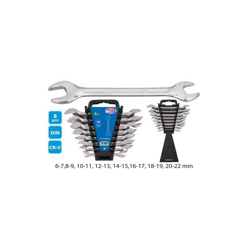 Set di chiavi fisse con trattamento termico e cromatura opaca. L'angolo di recupero è di 30°, con 2 dimensioni per chiave. Viene fornito su supporto in plastica per l'esposizione.