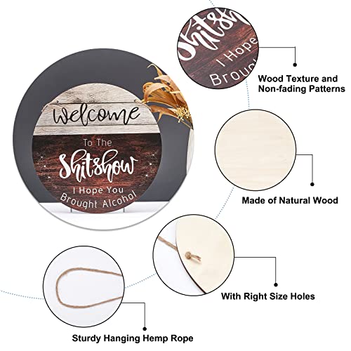 SEGNO DI BENVENUTO: questo piatto rotondo in legno da appendere ha uno sfondo marrone sella, il carattere artistico "benvenuto" è in alto, e sotto c'è un passaggio "to the shitshow, Spero che tu abbia portato alcol".
