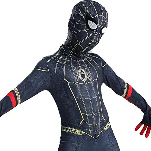 Costume da supereroe di alta qualità: ispirato al costume cosplay di film supereroi, la tuta copre tutto il corpo dal collo ai piedi, vestibilità aderente, trama ragno 3D, motivo a blocchi di colore nero, oro, cerniera che lo rende facile da indossare e togliere, il copricapo può essere rimosso e rimosso per un uso separato.