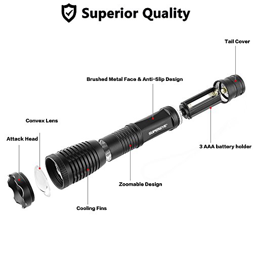 SuperEye, torcia LEDD Cree XML T6, IP65, regolabile, tattica, con funzione zoom, mini torcia per campeggio ed escursionismo, batteria 18650 inclusa