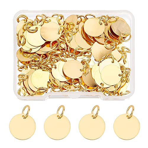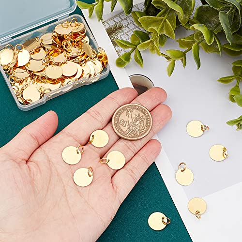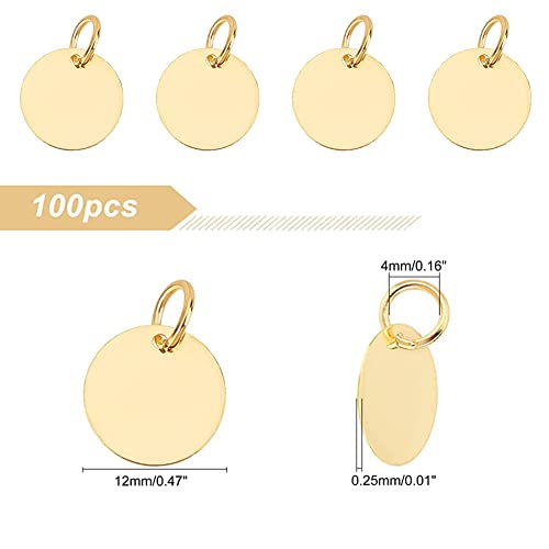 SUPERFINDINGS 100Pcs Ciondoli per Tag Vuoti in Ottone 12mm Timbri Piatti Rotondi in Metallo Tag Ciondoli Spazi Vuoti Dorati con Anello di Salto per Gioielli Fai da Te, Foro:4mm