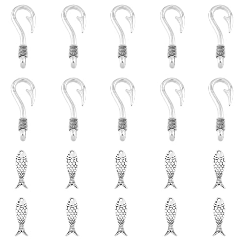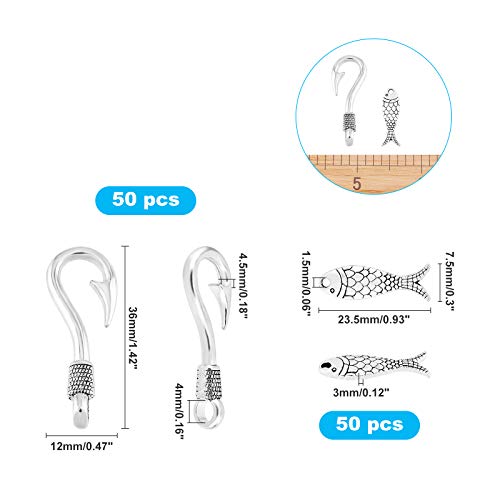 SUPERFINDINGS Circa 50 pz Fascino di Pesce e Gancio Argento Antico Stile Tibetano Ciondoli in Lega di Zinco Ciondoli Pesci e Ganci Pendenti per Gioielli Che Fanno Collana Braccialetto Fai da Te