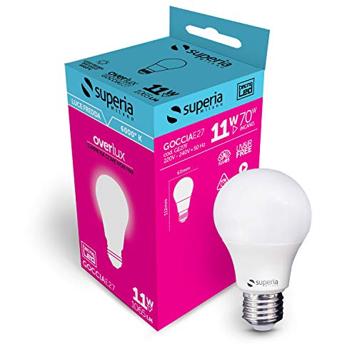 Superia Lampadina LED E27 Goccia, 11W (Equivalenti 70W), Luce Fredda 6000K RA80, Luminosa 1065 lumen, copertura opale A60, Attacco edison, Risparmio Energetico, Nessuno Sfarfallio, GE27F Pacco da 10