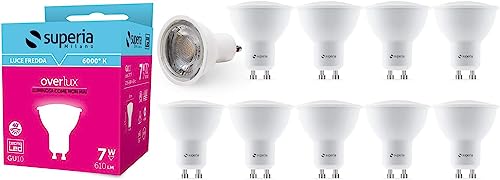 Superia Lampadina LED GU10 COB, 7W (Equivalenti 70W),Fascio Stretto 40° Luce Fredda 6000K RA80, Luminosa 600 lumen, Faretto incasso, Schermo opale, Nessuno Sfarfallio, CPT7F Pacco da 10