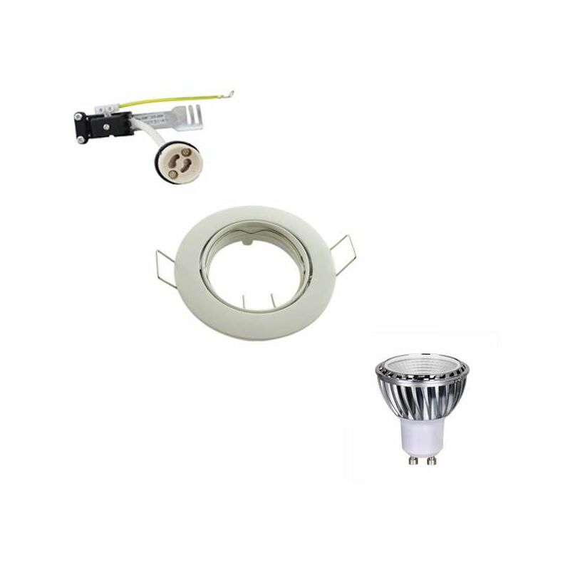 Kit spot LED GU10 Dimmerabile con una potenza di illuminazione 5W 50W. Questo kit all-in-one comprende: un supporto spot da incasso inclinabile bianco + una presa in ceramica GU10 + lampadina LED GU10 5W COB Dimmable - Luce bianca calda ombra 2700K. Spot diametro incasso 74mm, altezza totale 60mm. Supporto in alluminio bianco rotondo. 2700K 5W 50W 450 90° Un completo kit GU10 Questo set include una lampadina LED GU10 5W COB Dimmerabile con illuminazione equivalente a 50W. Questo posto ha un angolo di illuminazione di 90° e una potenza luminosa di 450 lumen. Il bulbo è associato a una presa in ceramica bianca GU10 che consente il collegamento diretto alla rete di alimentazione 220V e un supporto spot da incasso rotondo per incassare la lampadina nel soffitto. Imballaggio: Kit tutto compreso Consumo di watt: 5 W Materiale: Alluminio Indice di protezione IP: IP20 Colore: Bianco Modulo: Rotondo Attacco: GU10 Flusso luminoso (lumen): 450lm Angolo di illuminazione: 90° Durata di