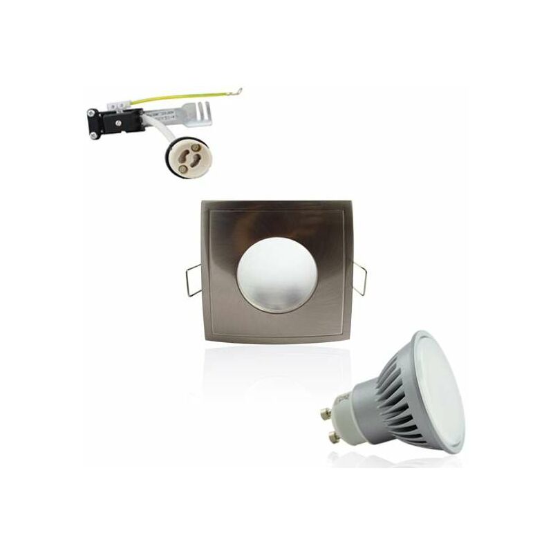 Kit spot LED GU10 in alluminio quadrato impermeabile da incasso spazzolato. Lampada da soffitto completa: incasso incasso spot supporto fisso bianco IP65 + presa GU10 ceramica + lampadina LED GU10 6W illuminazione 50W ampio angolo Luce bianca ombra del giorno 6400K. Recess del posto 65mm. Supporto in alluminio spazzolato. Altezza 55mm. 6400K 6W 50W 450 120° IP65 Piastra impermeabile GU10 IP65 6W equivalente 50W Questo set comprende: un punto GU10 6W equivalente 50W angolo largo 120° e una potenza luminosa di 450 lumen. Il bulbo è associato a una presa in ceramica bianca GU10 che consente il collegamento diretto alla rete elettrica 220V un supporto spot da incasso quadrato bianco incassato incassato che consente di incassare la lampadina nel soffitto in modo a tenuta stagna. Ideale per bagni o camere umide. Imballaggio: Kit tutto compreso Consumo di watt: 6 W Materiale: Alluminio Indice di protezione IP: IP65 Colore: Alluminio Modulo: Quadrato Attacco: GU10 Flusso luminoso