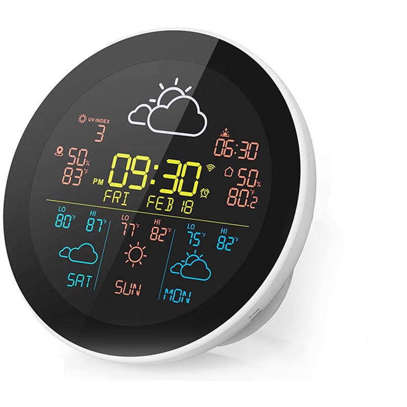 Questo orologio meteo wifi tuya con schermo LCD a colori, adotta sensori ad alta precisione per una misurazione più accurata della temperatura e dell'umidità. Supporta la visualizzazione dell'ora, della data, dello stato meteorologico, della temperatura e dell'umidità interna, della temperatura e dell'umidità di rete, delle previsioni meteo per i prossimi 3 giorni, ecc. Ottenere automaticamente i dati meteo e sincronizzarli. Controllo intelligente dell'APP, promemoria dell'impostazione della funzione di allarme della pressione dell'aria/ultravioletta/velocità del vento/temperatura e umidità, e possibilità di visualizzare i dati storici della temperatura e dell'umidità. Può supportare 3 sub-macchine e rilevare la temperatura e l'umidità di diverse posizioni allo stesso tempo. Caratteristiche: L'involucro è realizzato in materiale ABS, di qualità affidabile e di lunga durata. Ampio display LCD, 3 livelli di retroilluminazione regolabili, di facile lettura, con funzione di