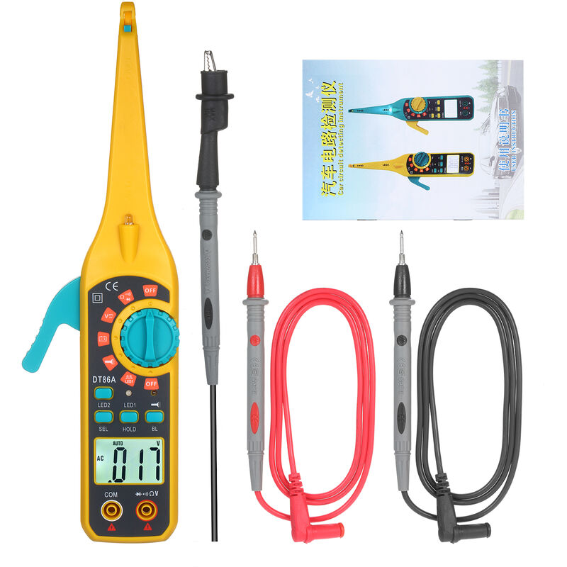 Questo piccolo e pratico strumento e professionale per la risoluzione dei problemi di auto, SUV e altri veicoli. Caratteristiche: Tester per circuiti automatici multifunzionale: utilizzato principalmente per la misurazione di tensione, resistenza, diodi, accensione / spegnimento del circuito e emettera un suono se inferiore a 30 Ω durante il test di cortocircuito. Gancio della sonda di prova: rilevamento accurato del guasto della linea interna senza rimuovere il coperchio del cavo. La sua forma sottile e particolarmente perfetta per operare senza problemi in spazi ristretti. Schermo LCD HD: visualizza i dati in modo chiaro e intuitivo, massimo 1.999 display con retroilluminazione per controllare facilmente la lettura in condizioni di scarsa illuminazione. Funzione di illuminazione: progettata con una piccola lampada a LED per illuminazione ausiliaria nelle aree scure. Tester portatile ergonomico: attrezzatura intuitiva e pulsante per passare da una funzione all'altra, facile da usare