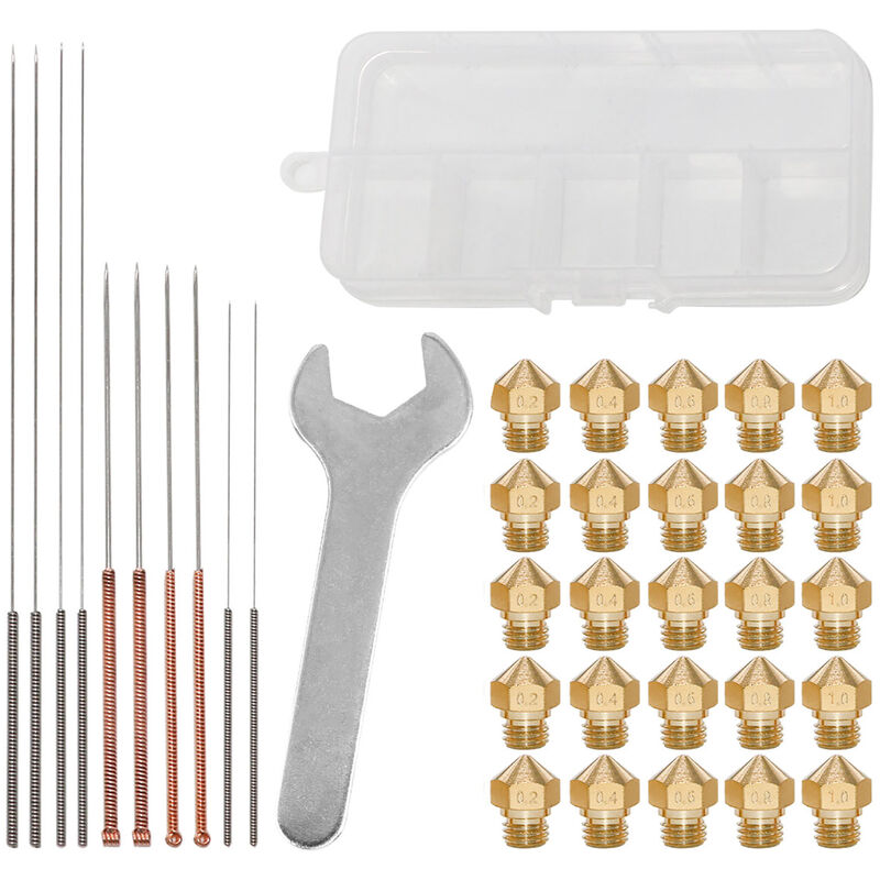 Ugelli a cinque diametri 0,2 / 0,3 / 0,4 / 0,6 / 0,8 mm per una facile manutenzione. Viene fornito con una scatola di plastica trasparente per riporre questi accessori, comodo da usare. Gli aghi sono realizzati in materiale di acciaio inossidabile e il filo di rame della maniglia è avvolto dalla macchina avvolgitrice automatica della maniglia. La lavorazione fine, l'impugnatura e il corpo dell'ago non sono facili da separare e cadere. Compatibile con FlashForge Creator Pro, Creator X, Dreamer, Finder, Inventor, Dremel Idea Builder, Powerspec 3d Pro, Powerspec 3d X, Wanhao Duplicator 4S, Wanhao Duplicator 4x, Wanhao I3, Monoprice Maker select plus, qidi tech, cocoon create e così via sopra. specifiche tecniche: Ugello MK10 in ottone Materiale ugello