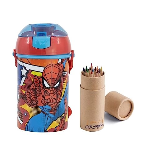 OM SUPPLIES Spiderman - Borraccia pop-up con cordino per il collo, per bambini, 450 ml, include 12 matite (Spiderman)