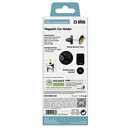 SBS Supporto Magnetico Universale da Auto, Porta Cellulare con Clip per Le bocchette d'Aria del cruscotto, placchette Metalliche Incluse