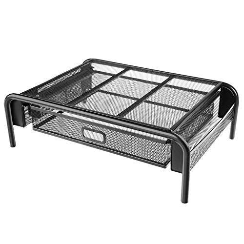 Supporto per Monitor, Supporto per Stampante in Maglia del Metallo con Cassetto Estraibile per Archiviazione e Scomparti Laterali per Computer, Laptop, iMac, Scrivania, Penne, Telefoni, Calcolatrici