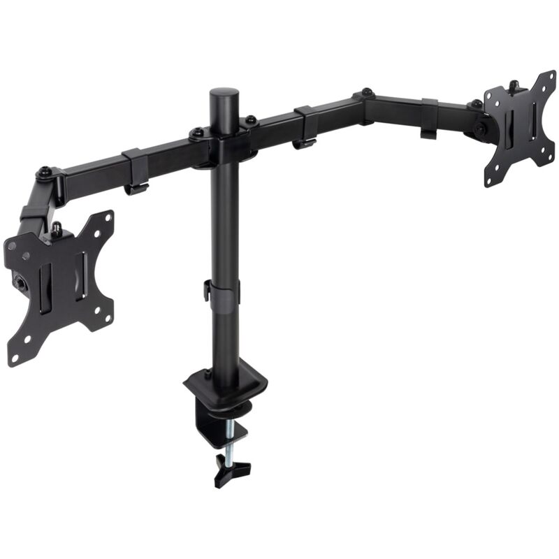 Supporto per schermo piatto tipo albero da tavolo. È un supporto basato su un palo, attraverso il quale è possibile spostare il braccio articolato che sostiene due schermi. Soluzione ideale per gli uffici, poiché due monitor non occupano tanto spazio sul tavolo. Specifiche Perforazioni compatibili con monitor LCD VESA 75 e 100 (rispettivamente 75 x 75 mm e 100 x 100 mm). Progettato per monitor e schermi da 13 "a 27". Ogni braccio sostiene un peso massimo di 8 Kg. 455 mm di lunghezza del collo e 35 mm di diametro. L'attacco dei due monitor può essere regolato in altezza lungo l'albero. L'albero è fissato al tavolo per mezzo di un morsetto a pressione (da 10 a 88 mm) con un laccio emostatico. È anche possibile fissarlo con viti direttamente al tavolo, per una finitura più professionale e robusta. Ciascun giunto sferico dei bracci articolati consente una rotazione di ± 180 °. Il giunto sferico sul supporto VESA consente di regolare l'inclinazione verticale (± 15 °) e orizzontale (± 30