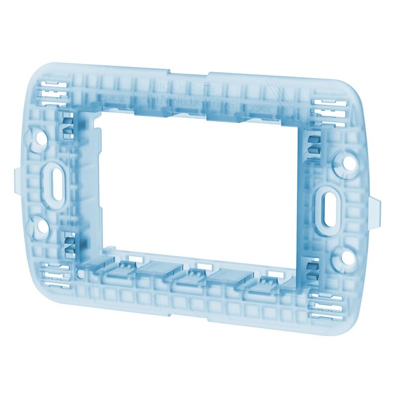 Il supporto portafrutti, detto anche cestello portafrutti, realizzato in plastica di colore azzurro, per scatola rettangolare 503 a 3 posti è compatibile con la serie civile BTicino Livinglight. La confezione include il set di viti per il fissaggio alla scatola portafrutti.