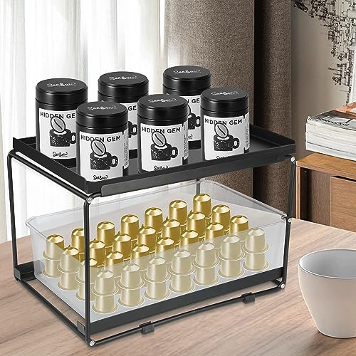 【Cassetto a cerniera】Le guide lisce del cassetto consentono di scivolare facilmente e accedere rapidamente alle capsule di caffè preferite, e quando hai finito di gustare il tuo caffè preferito, basta scorrere il cassetto sotto l'armadio.