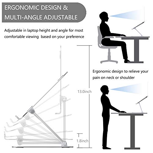 Ergonomico e regolabile: il supporto per laptop ha varie altezze e angolazioni regolabili, può elevare l'altezza dello schermo del notebook a un livello perfetto degli occhi per una migliore ergonomia, evitando di piegarsi sullo schermo, riducendo il dolore al collo e alle spalle, si adatta perfettamente all'uso della casa e dell'ufficio