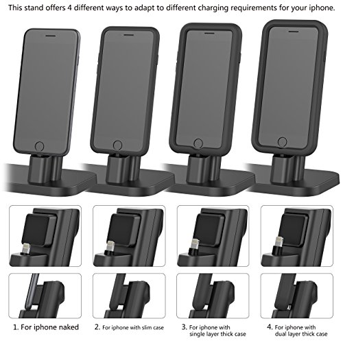 Supporto di ricarica per Apple Watch e iPhone con piattaforma di sollevamento che rende il supporto facilmente compatibile con quasi tutti gli Apple Watch (senza o con custodia);