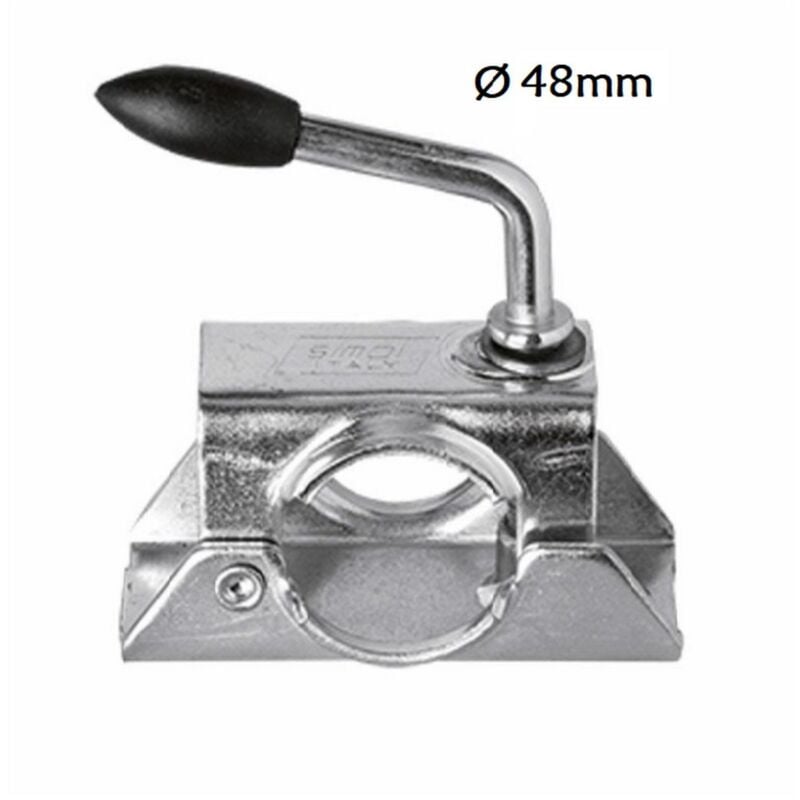 Supporto per ruotino servotimone d'appoggio da d.48 mm. per tutti i rimorchi caravan che montano il ruotino da diametro 48 mm Sistema di fissaggio mediante due fori laterali struttura in acciaio zincato