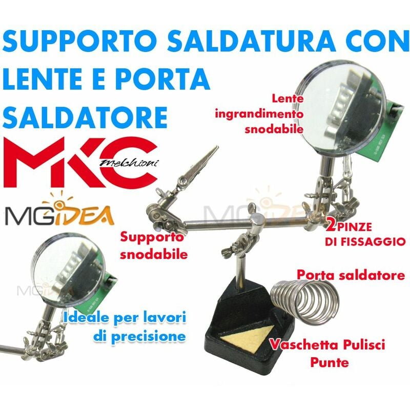 Pratico E Robusto Supporto Snodabile Dotato Di: - Lente Per L'Ingrandimento Visivo Dell'Area Di Lavoro O Delle Scritte Sui Componenti. - Comodo Porta Saldatore - Vaschetta Pulisci Punte - Due Bracci Regolabili In Acciaio Nichelato Che Consentono La Regolazione Della Posizione Di Lavoro In Modo Ottimale. Strumento Ideale e indispensabile Per Hobbisti E Laboratori. Contenuto: 1 - Supporto Mkc-10G Con Lente E Pulisci Punte
