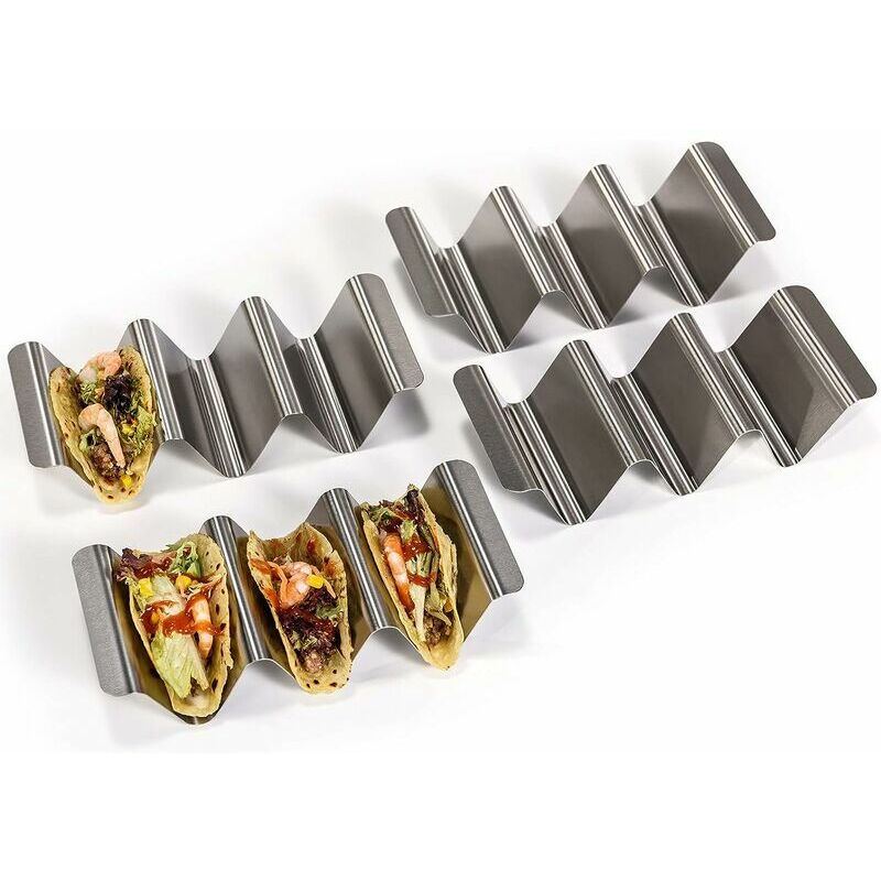 Acciaio inossidabile 18/8: non si arrugginiscono facilmente. Molto più facili da pulire perché sono solo un solido pezzo di acciaio inossidabile. Basta gettare in lavastoviglie o lavare a mano. Sono impilabili in modo da non occupare molto spazio nei tuoi locali., Aperture larghe 2,36 pollici - abbastanza larghe per un guscio duro di taco che è necessario. Il fondo bombato non fa sì che il fondo dei gusci si rompa facilmente e perda la carne dal fondo. Puoi avere 2 o 3 tacos a seconda che li capovolgi.Le maniglie laterali di 2 cm lo rendono facile da trasportare: puoi spostarli facilmente dal fornello/forno al tavolo da pranzo o al piatto. Il bordo liscio non farà male alle dita. Con uno spessore di 0,8 mm, non si deforma facilmente.,Funzioni versatili: tengono i tacos in posizione verticale mentre aggiungi i condimenti, rendendo molto più facile preparare i tuoi tacos! Puoi usarli per preparare una varietà di tacos per un gruppo di amici amanti dei tacos! Può anche contenere