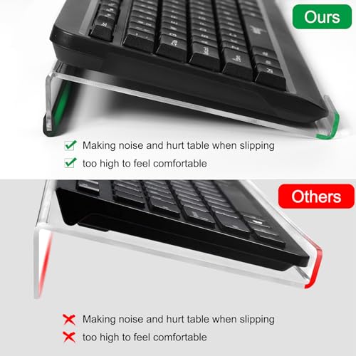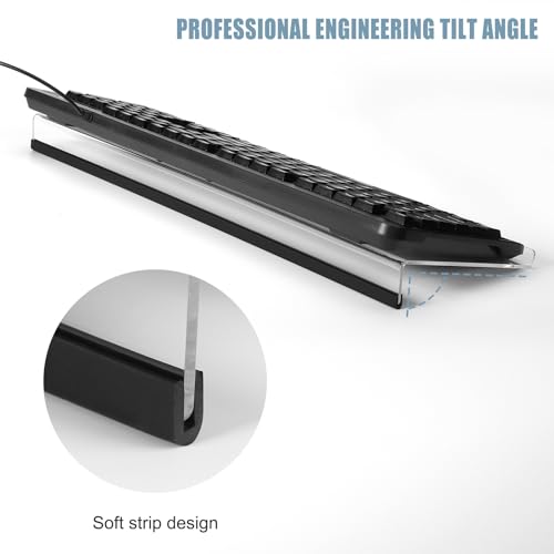 Design Ergonomico: La dimensione del supporto per tastiera in acrilico è 43,2×14,5×3 cm, adatta per la maggior parte delle tastiere standard, progettata con bordo anteriore e striscia antiscivolo, non cadrà facilmente.