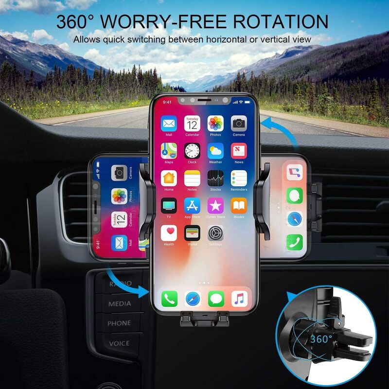Supporto per telefono veicolare con l'ultimo design di chiusura del 2020. Il gancio afferrerà saldamente le lame della presa d'aria dell'auto. Le piastre di bloccaggio a molla e i dadi di bloccaggio garantiscono una tenuta assoluta. Anche se la strada è accidentata, non cadrà come altri prodotti. [Angolo di visione illimitato]: il supporto per telefono veicolare consente una rotazione di 360 gradi, offrendoti il miglior angolo di visione. Puoi posizionare il telefono con qualsiasi orientamento. (Orizzontale, verticale o più) Sia che tu stia parlando, ascoltando musica o caricando, puoi vivere un'esperienza di guida più sicura. [Facile da installare]: grazie all'ultimo eccellente design, l'auto con staffa telefono consente di operare con una mano. Premi il pulsante sul retro per aprirlo e posizionarlo sul telefono, quindi premi i bracci sui lati per fissare il telefono. [Compatibilità universale]: questo supporto universale per telefono da auto è compatibile con quasi qualsiasi