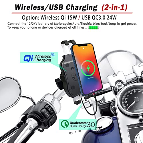 【Supporto per caricabatterie 2 in 1】 Caricabatterie Qi wireless/USB QC3.0. Chip sensore wireless sensibile. La ricarica wireless leggera è l'ideale per i motociclisti attivi senza cavi. Libera la mano durante la guida, non perdere mai chiamate e messaggi importanti.