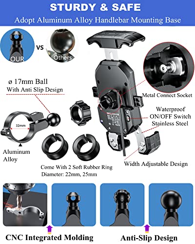 ➤ L'uscita del caricatore wireless per montaggio del telefono della motocicletta 15 W max, uscita porta USB C 20 W max. Questo supporto per caricabatterie per telefono da moto supporta la ricarica di due dispositivi compatibili contemporaneamente. IP66 impermeabile.