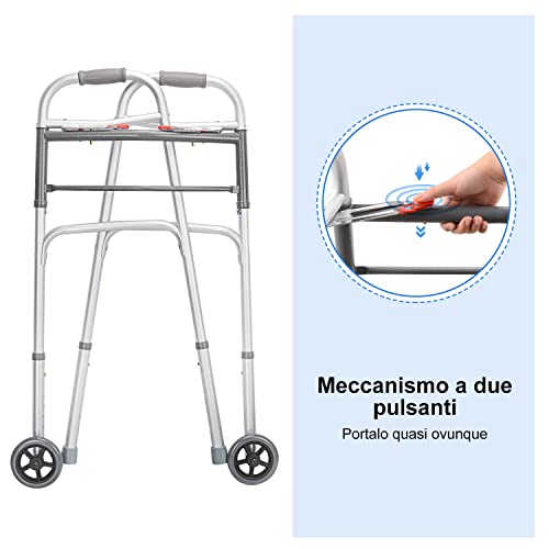 Supregear Deambulatore Pieghevole Standard, Deambulatore Pieghevole Alluminio in Lega Regolabile a due Pulsanti con Ruote da 13 cm per Anziani Disabili Feriti, Supporto Fino a 226,8 kg, Argento