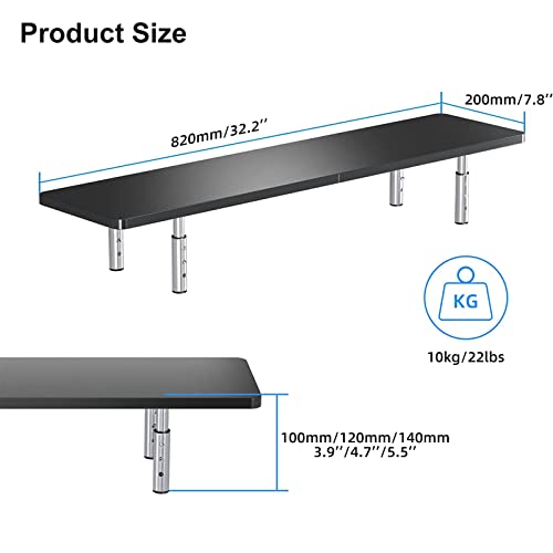 Il supporto per monitor ha una piattaforma in legno extra lunga 820 mm x 200 mm e gambe in metallo con 3 diverse altezze regolabili 100/120/140 mm. L'altezza può essere regolata premendo un pulsante, in modo da avere più spazio a diverse altezze per la scrivania a seconda delle esigenze. Per riporre le tastiere. Mouse. File. Libri, eccetera.