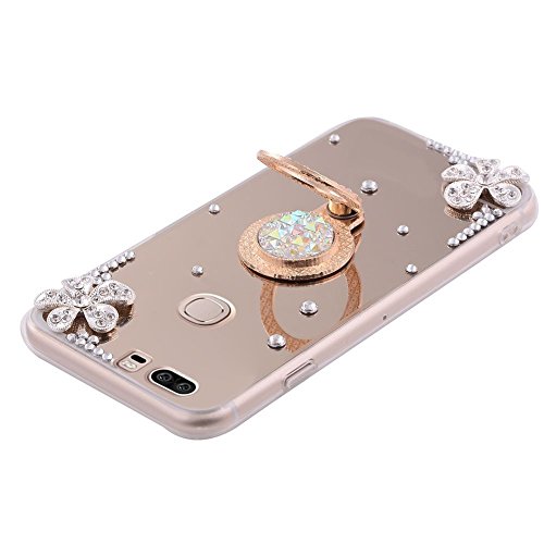 Surakey Cover Huawei Honor V8, Effetto Specchio Silicone Cover con Fiore Brillante Strass Bling Lusso Rotazione Grip Ring Supporto Case Ultra Sottile Protettiva Custodia per Huawei Honor V8,Oro